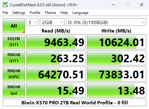 The 2TB X570 PRO is officially rated as up to 2000K IOPS for random reads and up to 1600K IOPS for random writes. Using the Peak Performance profile test of CrystalDiskMark 8 we couldn't quite get to those official maximums. The best read result we saw was 1,898,871 IOPS with the best write figure at 1,528,129 IOPS. Although we couldn't confirm the official figures, the random read result is the fastest we've seen to date for a consumer Gen 5 drive and both results are faster than what the 4TB drive produced.