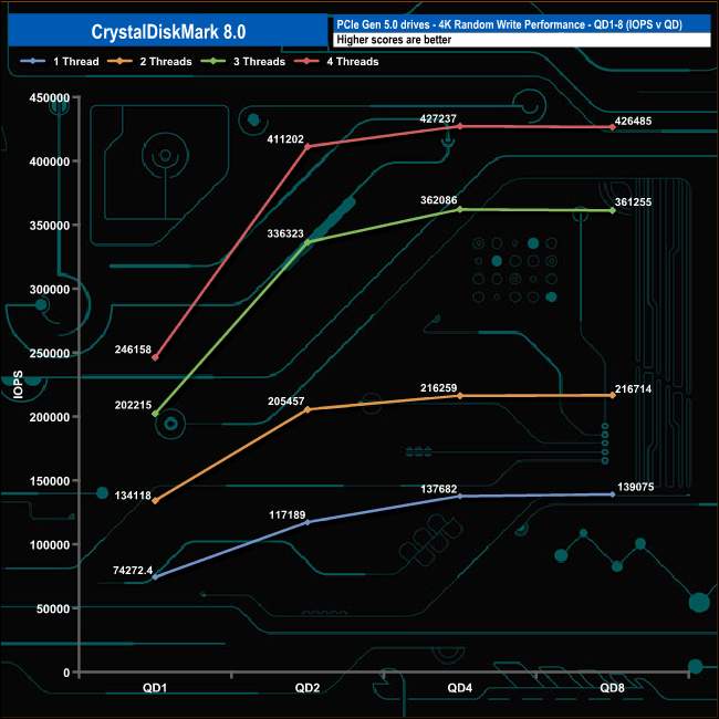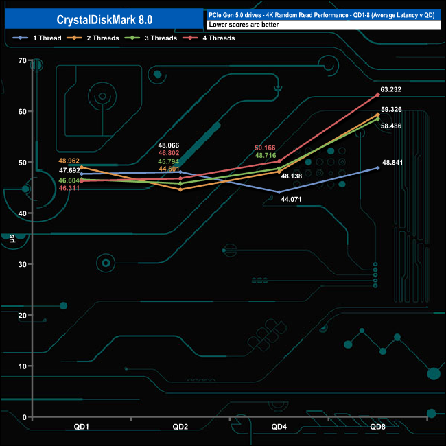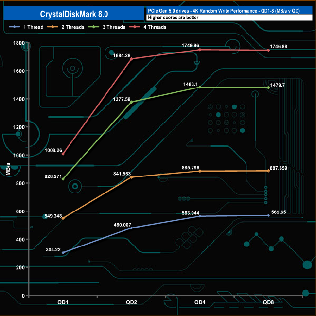 We used CrystalDiskMark 8 to test the random performance of the drive at lower queue depths (QD1 – QD8 where most of the everyday workloads occur) using 1 to 4 threads.