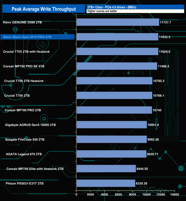 Although the tested peak write result of 11,632MB/s is somewhat short of the official maximum it is still good enough to put the drive in second place behind Klevv's GENUINE G560.