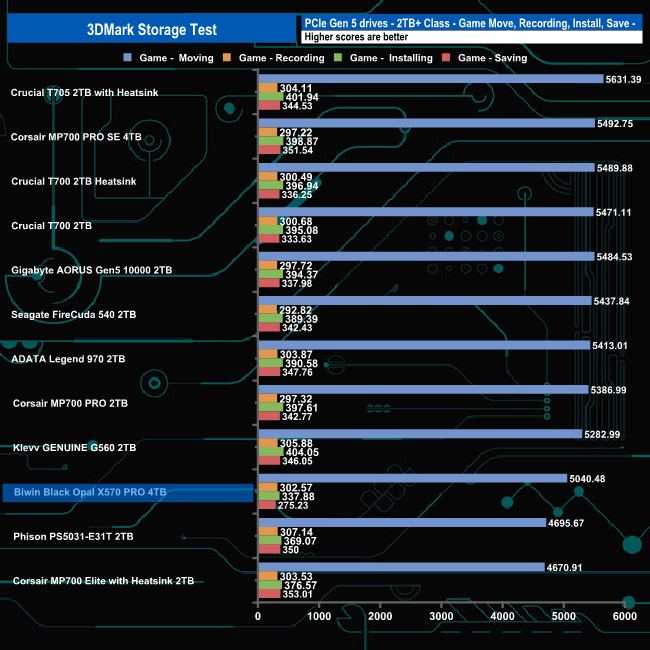 In the game moving, recording, installing and saving test traces the drive averaged 1,489.04MB/s with an average access time of 29µs (0.029m/s) for the four tests which see the drive in the penultimate spot in the table.