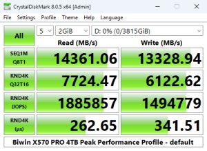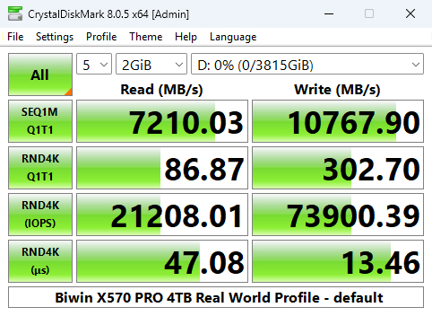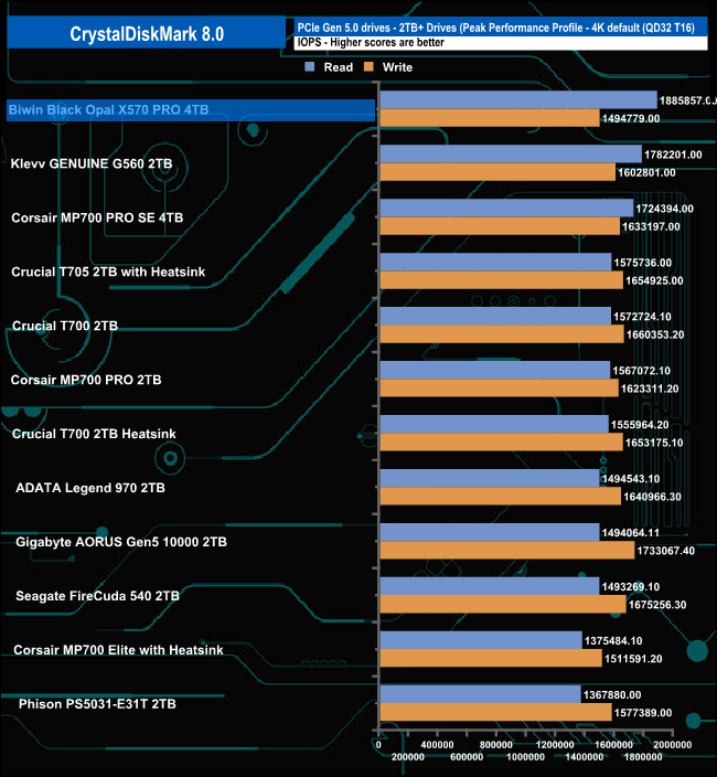 The 4TB X570 PRO is officially rated as up to 2000K IOPS for random reads and up to 1600K IOPS for random writes. Using the Peak Performance profile test of CrystalDiskMark 8 we couldn't quite get to those official maximums. The best read result we saw was 1,885,857 IOPS with the best write figure at 1,494,779 IOPS. Although we couldn't confirm the official figures, the random read result is the fastest we've seen to date for a consumer Gen 5 drive.