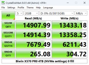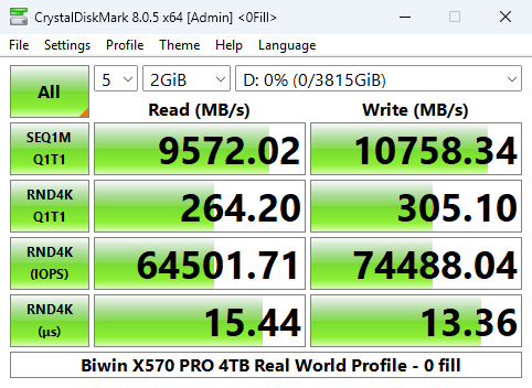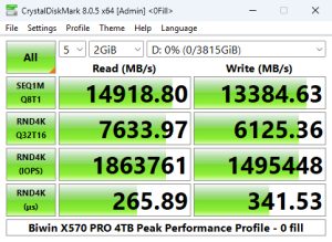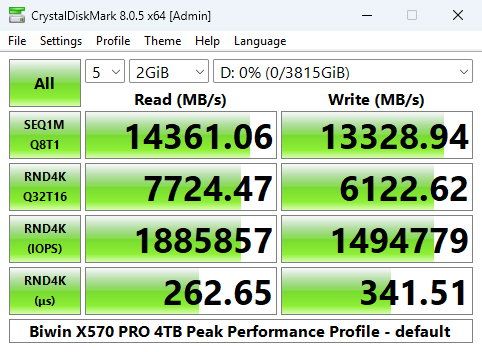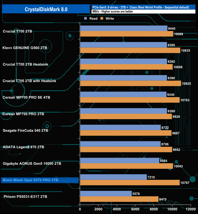 That 14,371.51MB/s read result places the 4TB X570 PRO in third place on the results chart. However, its write result of 13,408.04MB/s is the fastest we've seen for a Gen5 consumer drive to date.
