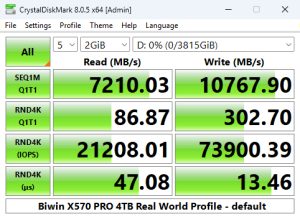 The X570 PRO sits in the penultimate place in the CrystalDiskMark 8 Real World result table with a read score of 7,216MB/s. However, its write score of 10.767MB/s is the third fastest we've seen for a Gen 5 SSD in this test.