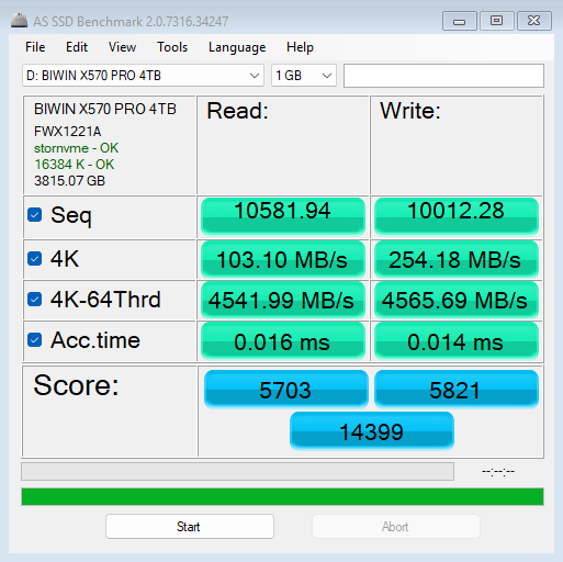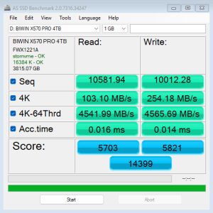 The X570 PRO's read score of 5703 in the AS SSD benchmark sees it in first place in the results table by some distance from the next best, Corsair's MP700 PRO SE drive. However, its write score of 5821 isn't anywhere near as impressive.