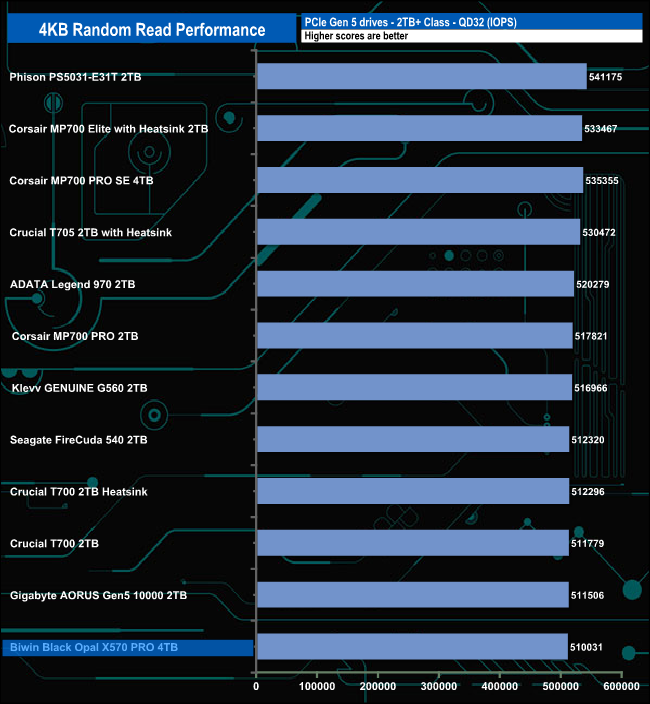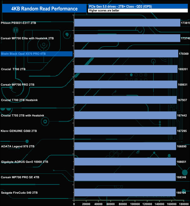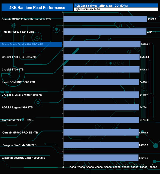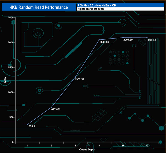 We used CrystalDiskMark 8‘s custom settings to test the 4K random read performance of the drive through a range of queue depths. The setup for the tests is listed below.