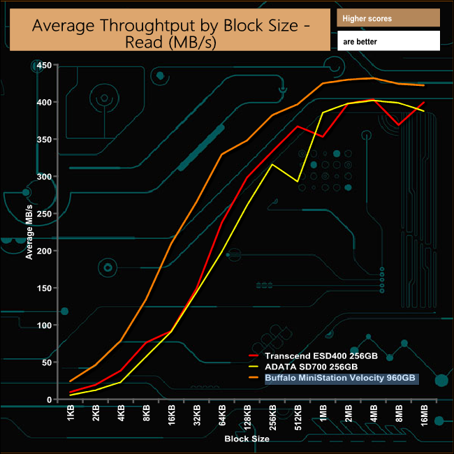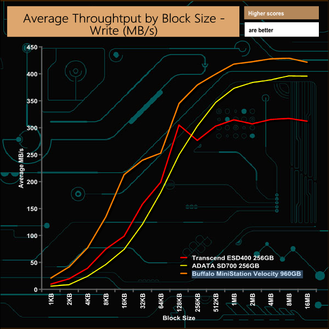 The 960GB MiniStation Velocity is a pretty consistent performer throughout the read performance curve, topping out at 431MB/s at a 4MB block size before dropping back a little.