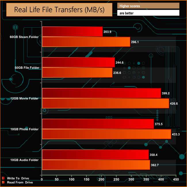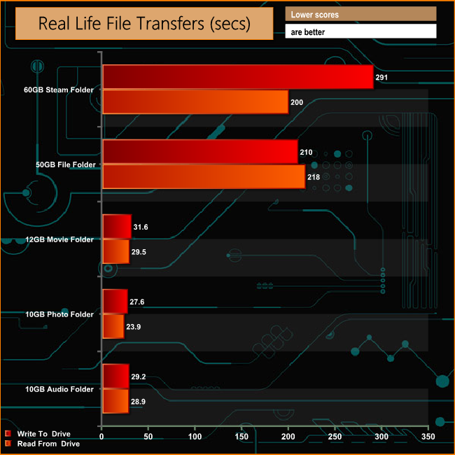 When it comes to dealing with real life data transfers the drive performed very well. Write speed averaged 316.32MB/s for the five tests while reads averaged 351.06MB/s, topping over 400MB/s for the 12GB Movie Folder and 10GB Photo Folder transfers.