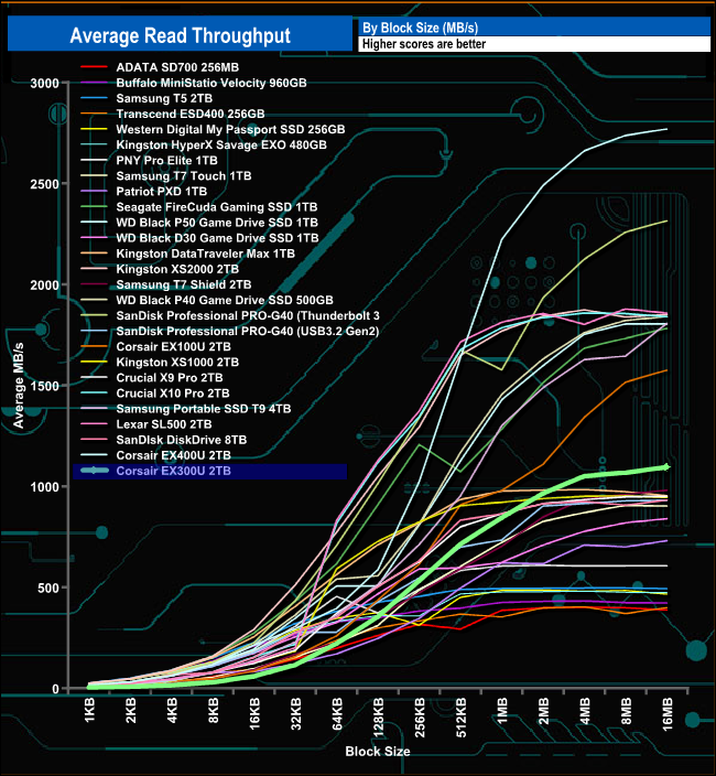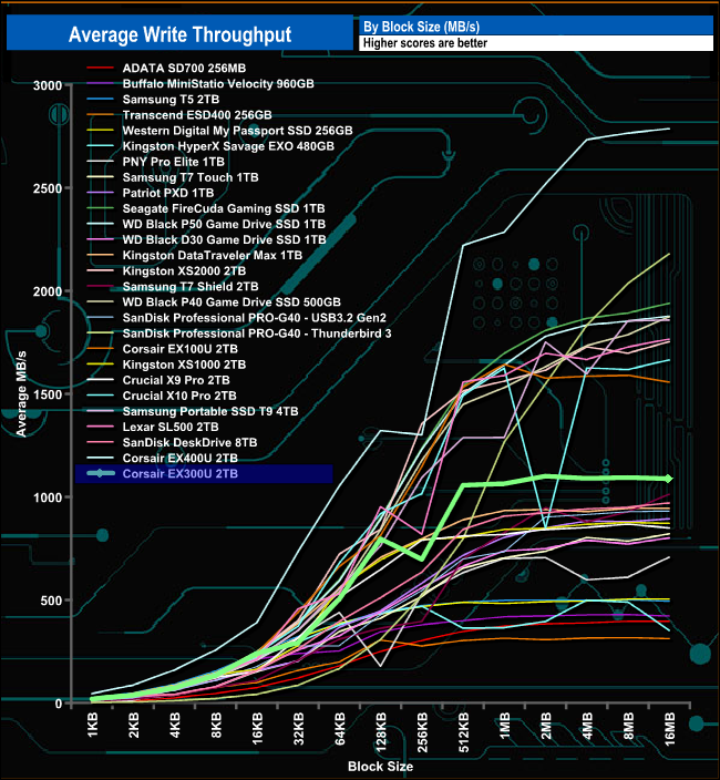 In our read throughput test, the drive peaked at the end of the test run (16MB block) at 1,095.1MB/s, just shy of the official maximum. Writes peaked at the 2MB block at 1100.86MB/s, confirming the official figure.