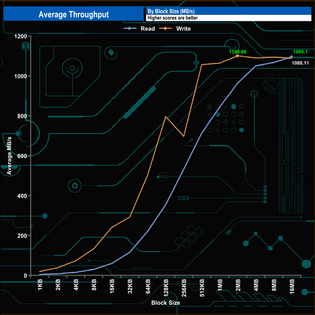 In our read throughput test, the performance peaked at 1,095MB/s at the end of the test run (16MB block), just shy of the official maximum of 1,100MB/s.