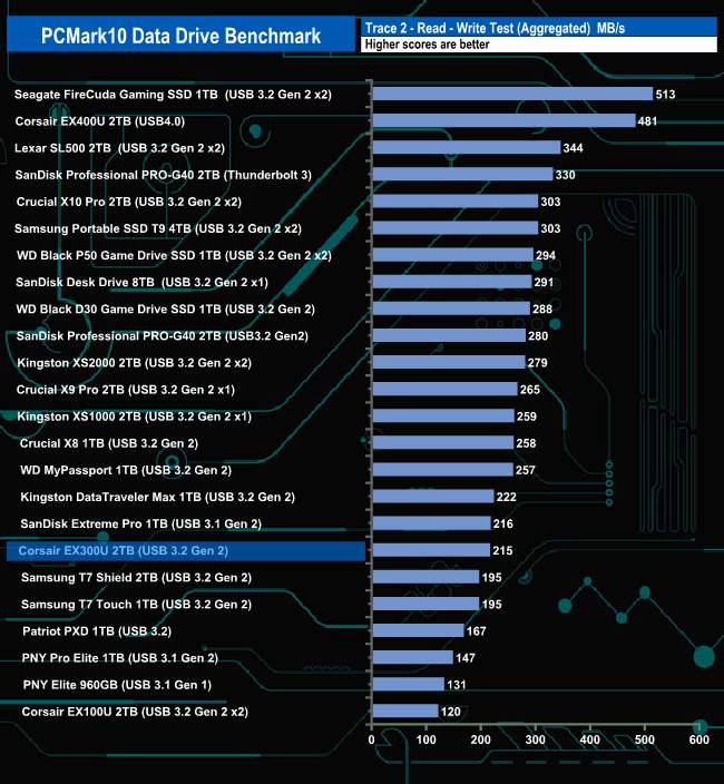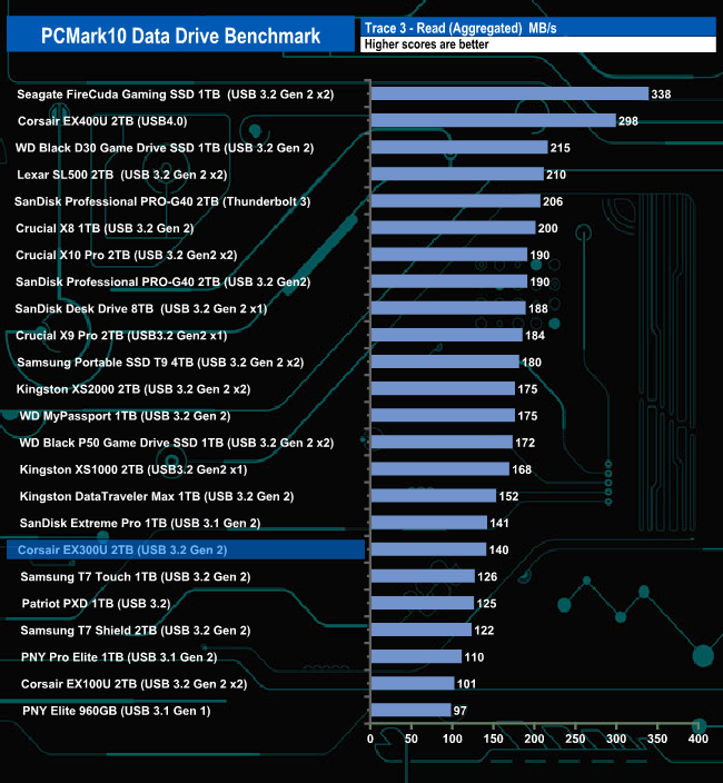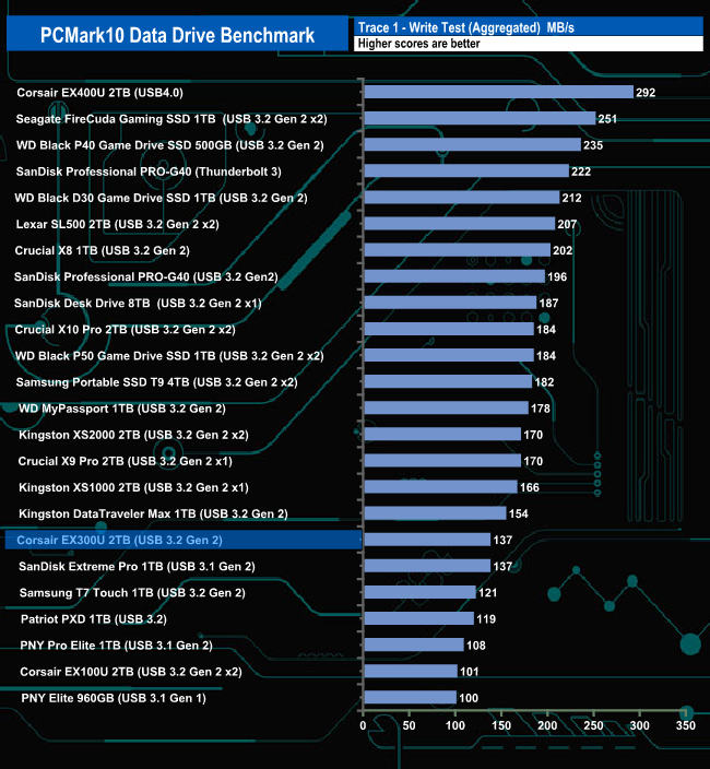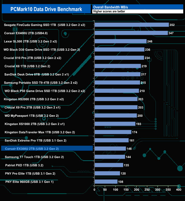 The Corsair EX300U doesn't seem to handle PCMark10's Data Drive Benchmark that well, ending up in the bottom half of the results charts for all three tests.