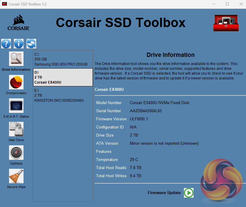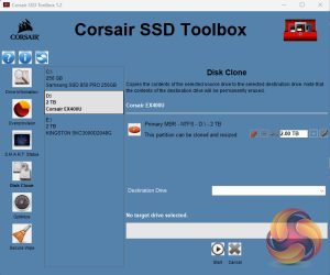 Corsair’s SSD management utility is called SSD Toolbox. It's not the funkiest-looking GUI we've ever seen but having said that, it does give all you really need to keep an eye on the drive. It provides drive information and S.M.A.R.T details and also supports firmware updates, secure wiping of the drive, and drive optimisation. It usefully incorporates a disk cloning utility.