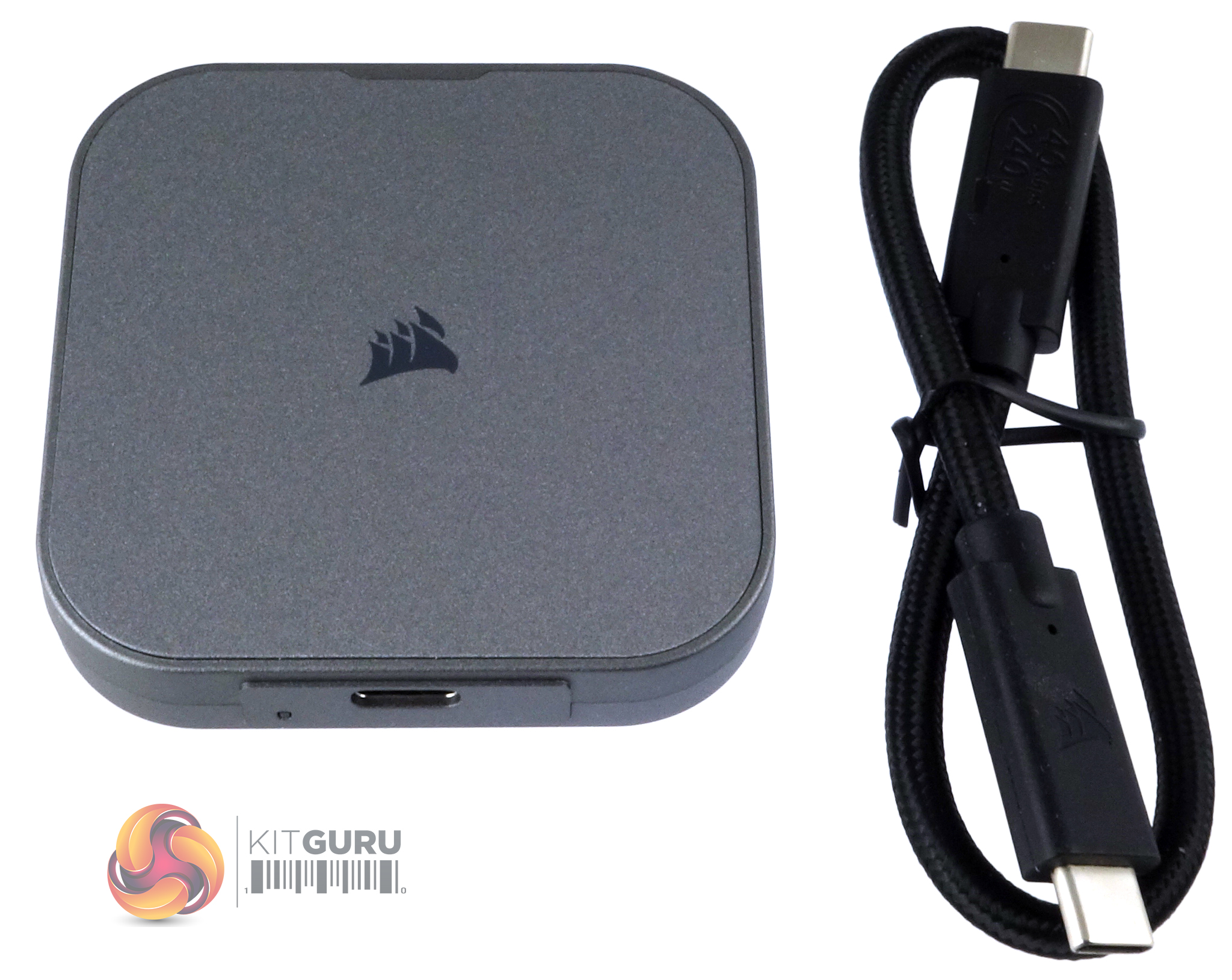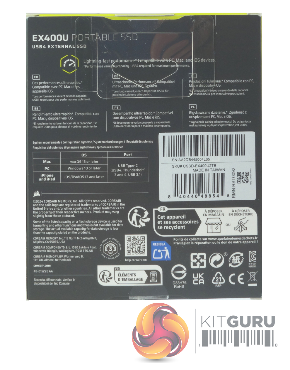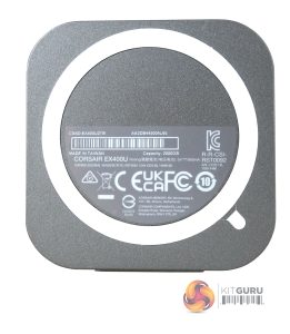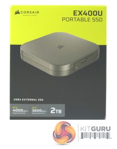 The EX400U comes in a compact box finished in the customary Corsair yellow and black colour scheme. On the front of the box is an image of the drive under which a label displays the headline Sequential read and write speeds (up to 4,000MB/s reads, up to 3,600MB/s writes) and the capacity of the drive.