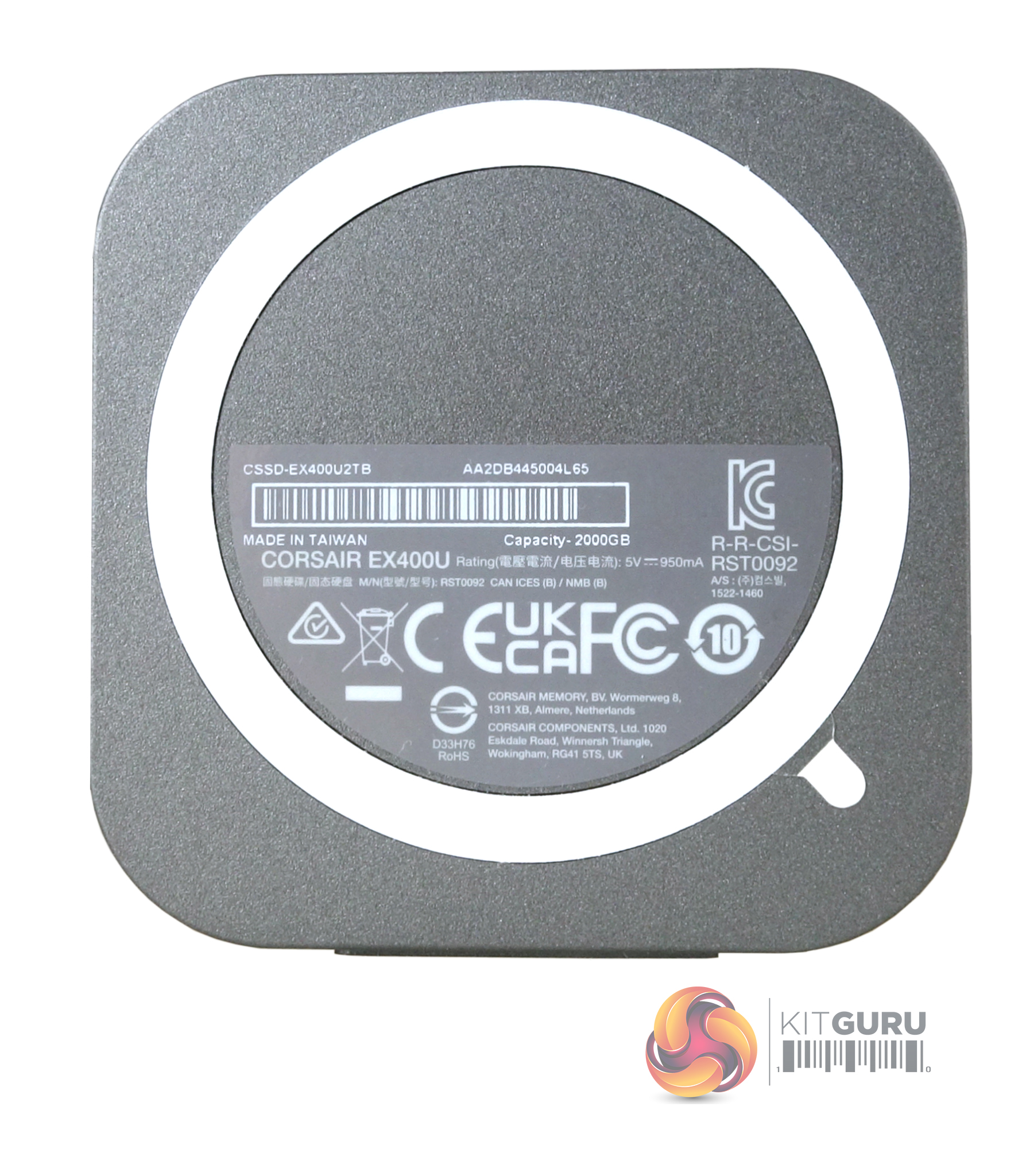 Constructed with plastic sides and bottom with an aluminium top the drive is finished in silver-grey and measures a wee 64.3mm x 64mm x 12mm and weighing in at 383g, it's small enough to fit in a shirt pocket. The bottom of the EX400U features a magnetic ring for easy attachment to any MagSafe-compatible device, such as iPhones.