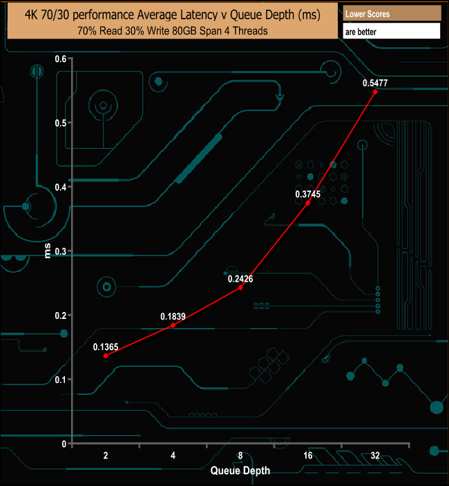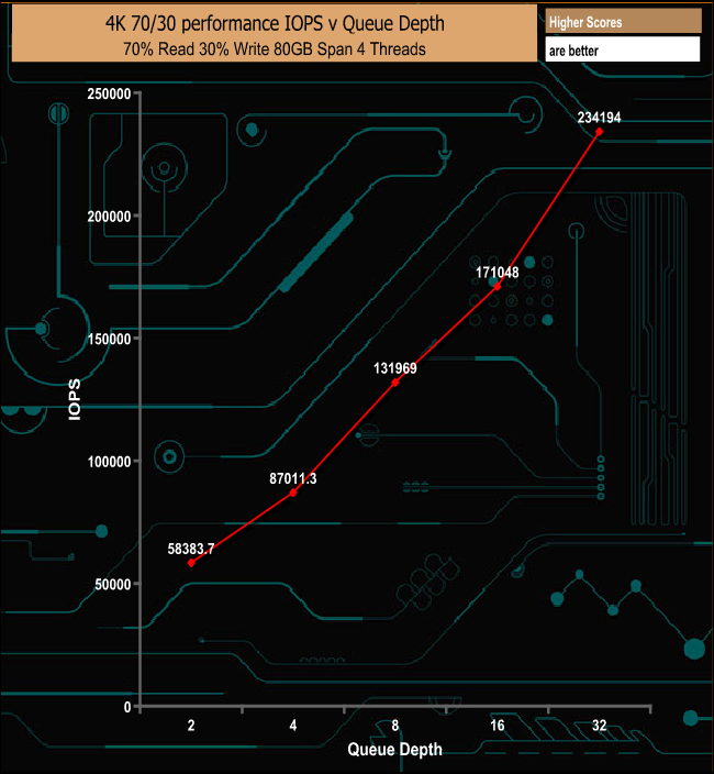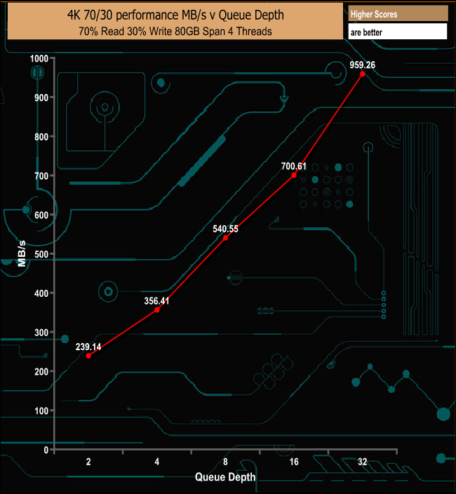 The MP510 handles the 4K 70/30 mixed read & write test pretty well, peaking at 234,194 IOPS (959.26 MB/s).