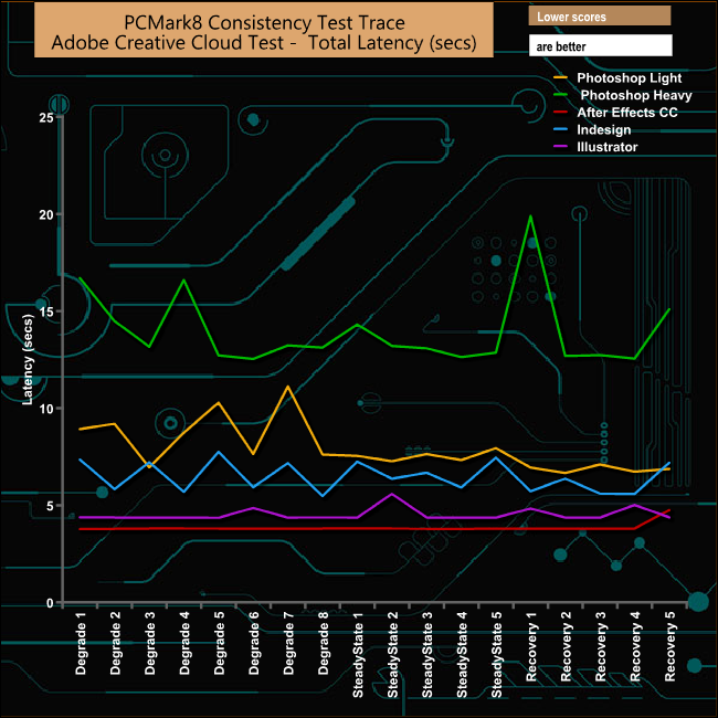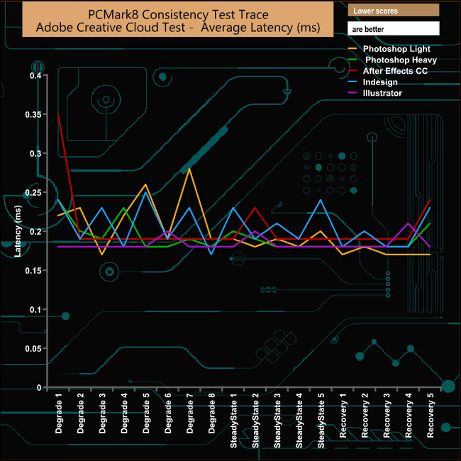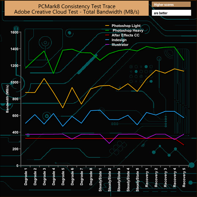 In the Adobe CC part of the test it's usually the Photoshop heavy test trace that causes a drive problems, but here the MP510 handled that test well and it was the Photoshop Light test that caused the drive to suffer.