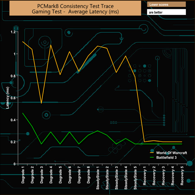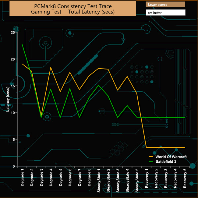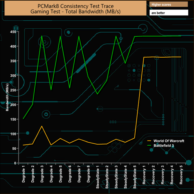 The drive doesn't handle the majority of the Casual Gaming test very well, with some significant drops in performance throughout the test run until it reaches the recovery phases. The performance of the drive through the recovery phases, during the World of Warcraft run, is very good indeed.