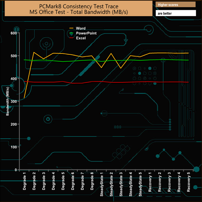 PCMark 8’s Consistency Test provides a huge amount of performance data, so here we’ve looked a little closer at how the 960GB Force MP510 performs in each of the benchmarks test suites.