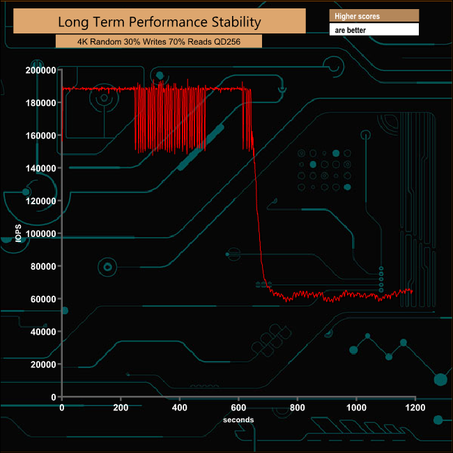 For the long term performance stability test, we set the drive up to run a 20-minute 4K random test with a 30% write/70% read split, at a Queue Depth of 256 over the entire disk. The 960GB MP510 averaged 129,549 IOPS for the test with a performance stability of 68.37%.