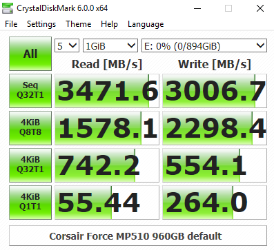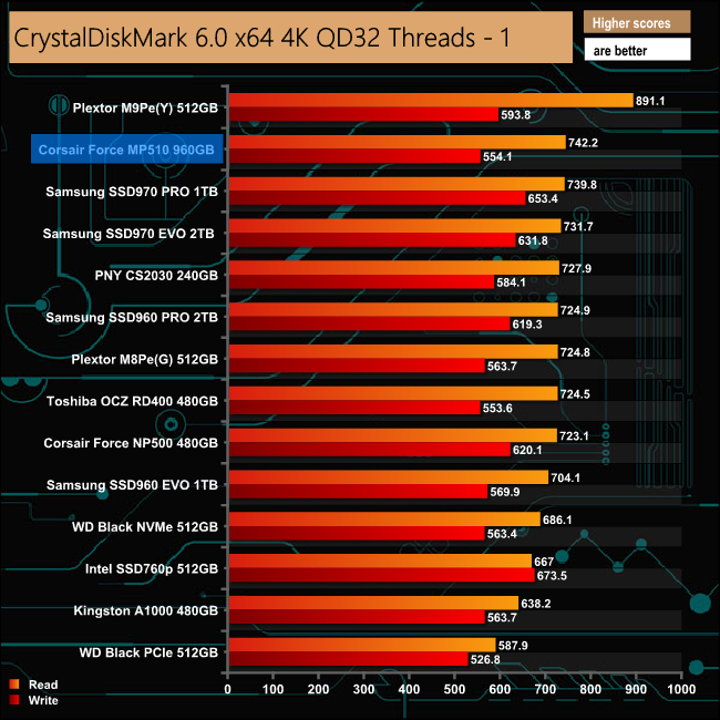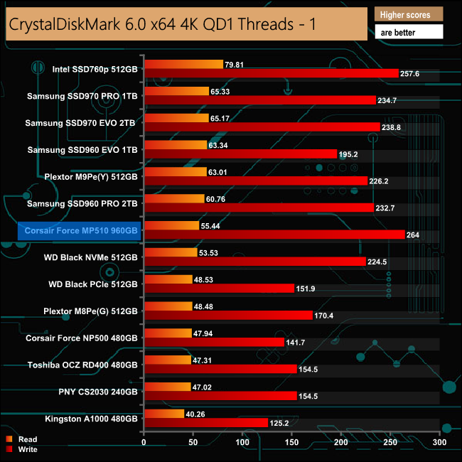 In the CrystalDiskMark benchmark, the MP510 sits firmly in the middle of the pack in the 4K test at a queue depth of 1, but even here the write performance is very impressive – in fact, its score of 264MB/s is the fastest write result we have seen to date for a consumer drive. However, deepening the queue depth sees the drive climb through the chart in to second place. There's a marked improvement in 4K read performance at lower queue depths when switching to the highly compressible data of CrystalDiskMark's 0 fill test.