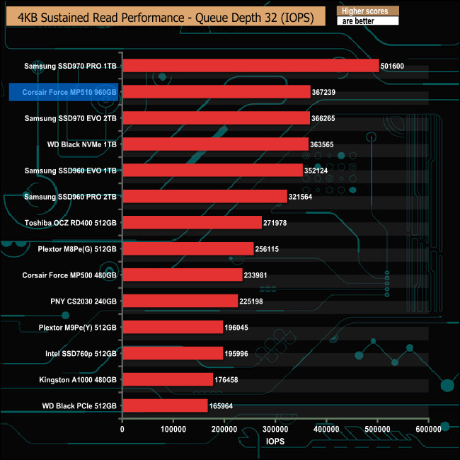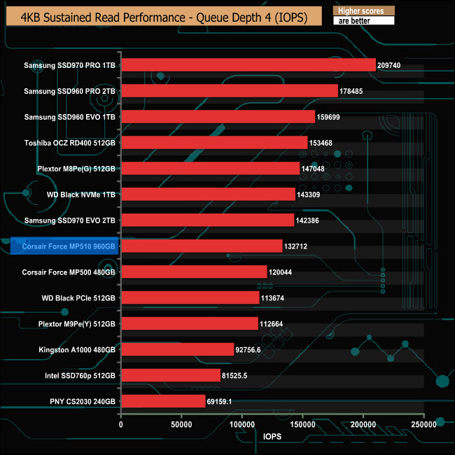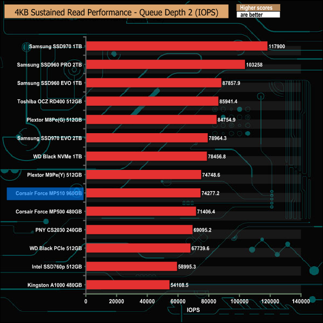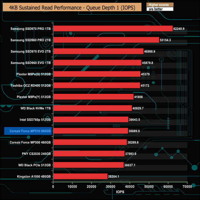 Corsair states that the MP510 is their fastest M.2 NVMe drive to date, something which we could confirm with our 4K Random read tests.