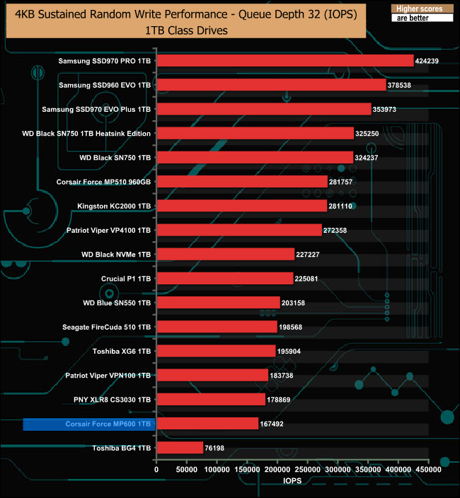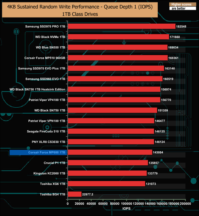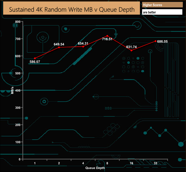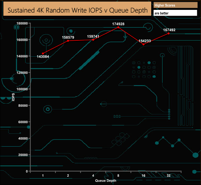 With our four threaded, 4K random write tests we couldn't get anywhere near to the official top end 600,000 IOPS. The best figure we saw from our own tests was 174,928 IOPS at a QD of 8.