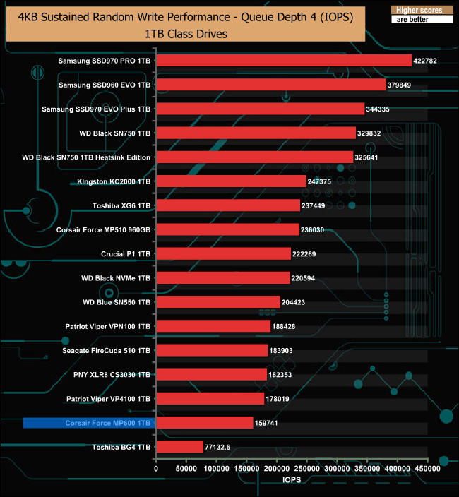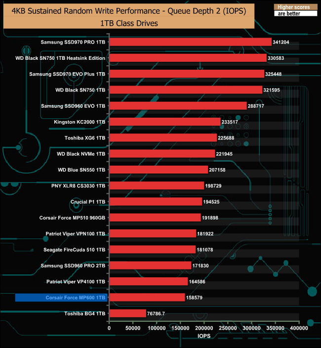 As with our 4K random read test results, the Force MP600 trails behind Patriot's Gen4 Viper VP4100.