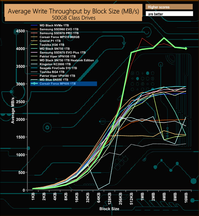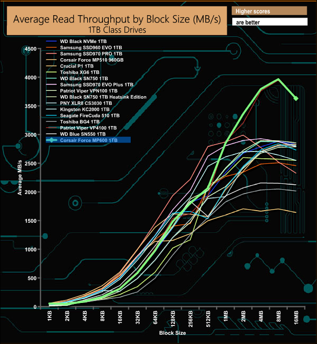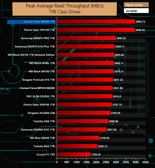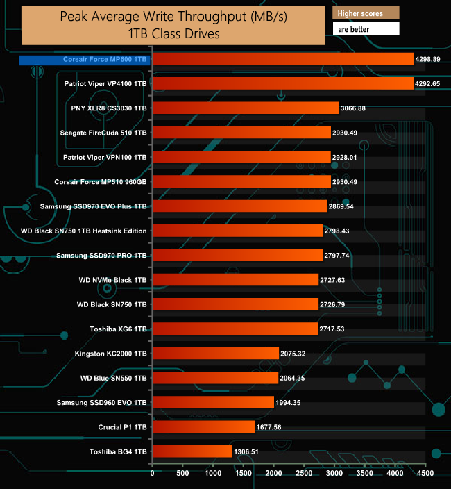 In our throughput test, the Corsair Force MP600 just has the edge over the other Gen4 SSD in the list, Patriot's Viper VP4100.