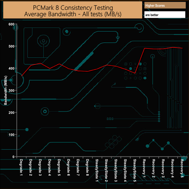 Overall the Corsair Force MP600 handles the rigours of the PCMark 8 Consistency test well, without any alarming dips in bandwidth during the test and it recovers pretty well from the ordeal.
