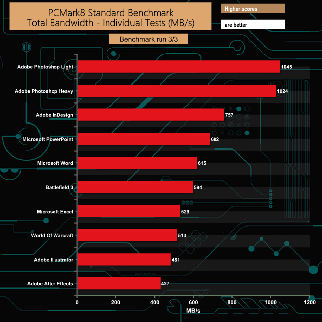 Just like the Consistency test, PCMark 8’s Standard Storage Test also saves a large amount of performance data. The default test runs through the test suite of 10 applications three times. Here we show the total bandwidth performance for each of the individual test suites for the third and final benchmark run.