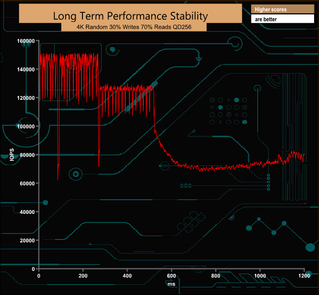 For the long term performance stability test, we set the drive up to run a 20-minute 4K random test with a 30% write, 70% read split, at a Queue Depth of 256 over the entire disk. The 1TB Force MP600 averaged 99,446 IOPS for the test with a performance stability of 66%.