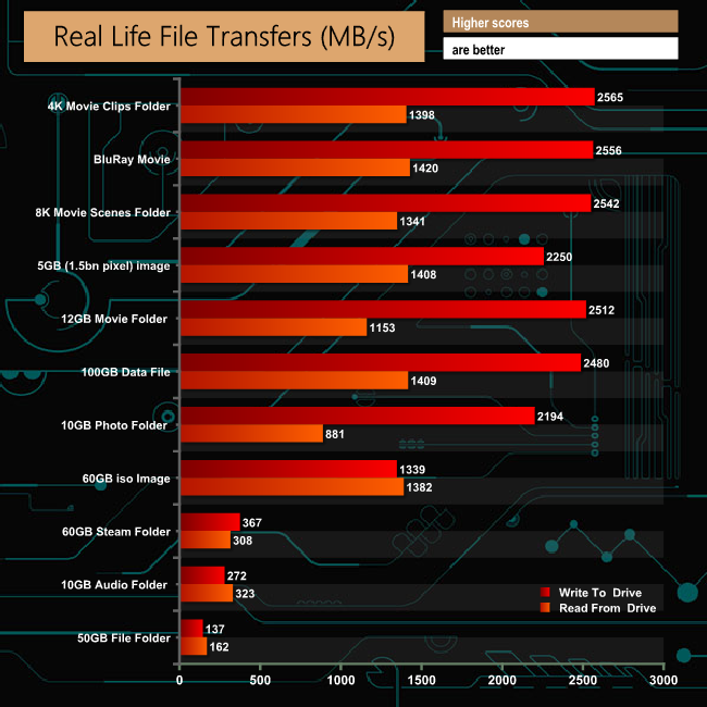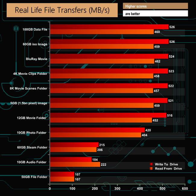 Taking the SATA SSD out of the picture gives an idea of just how capable the Force MP600 is. The 60GB ISO file took 1m 52s to write to the SATA drive and 2m 8s to come back the other way, whereas it takes just 44.1 seconds to write to the NVMe drive and 42.7 seconds to read the data back. The 21GB 8K movie scene folder took 31 seconds to write to the SATA drive but a mere 6 seconds to write to the Toshiba OCZ RD400 NVMe drive.