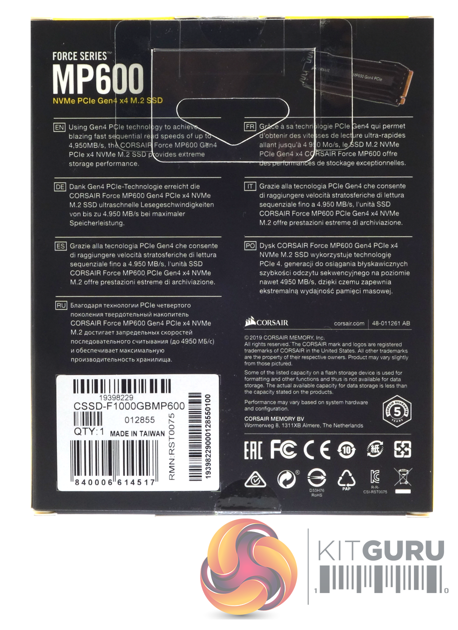 The drive comes in a fairly compact box with a clear image of the drive on the front. Under the image is a strip label with performance figures for Sequential and 4K performance as well as the drive's capacity. The rear of the box has multilingual information about the drive using a Gen4 interface.