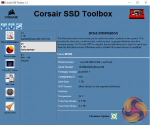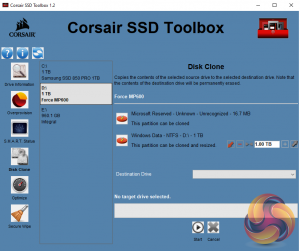 Corsair’s SSD management utility is called SSD Toolbox. It provides drive information and S.M.A.R.T details and also supports firmware updates, secure wiping of the drive, drive optimisation and incorporates a disk cloning utility.