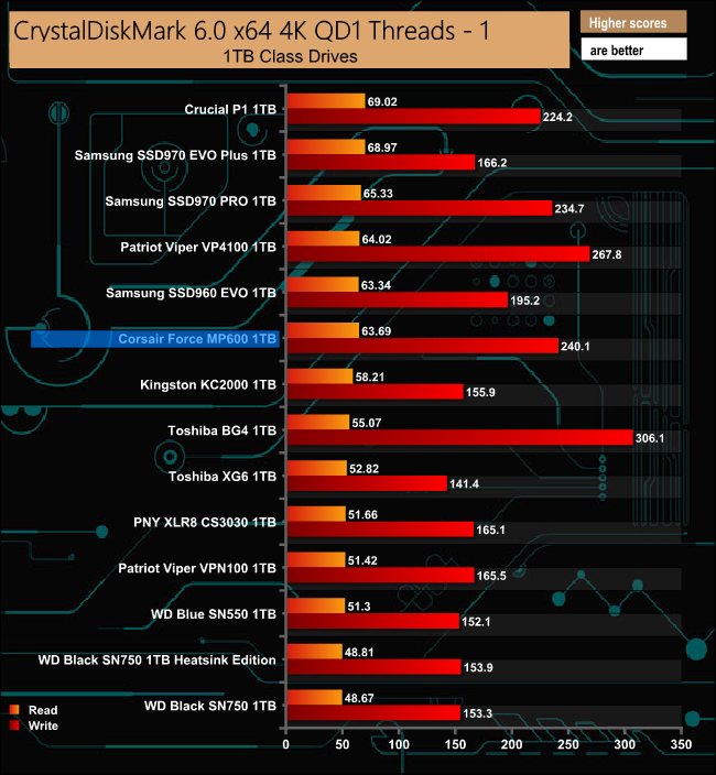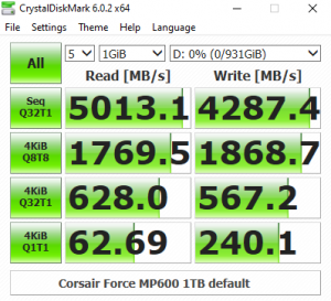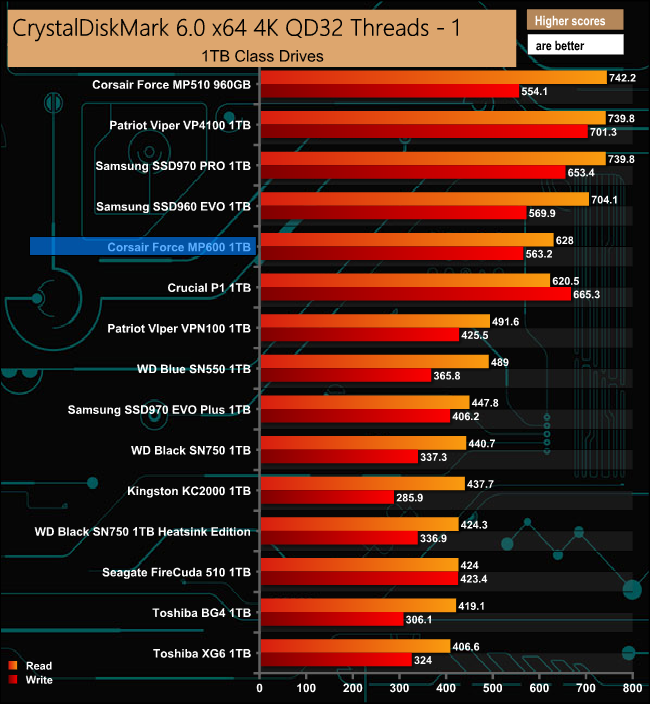 In CrystalDiskMark's QD32 test, the Corsair Force MP600 makes it into the top 5 fastest 1TB consumer drives we have tested to date, but it's not as fast as the other Gen4 drive we've tested, Patriot's Viper VP4100.