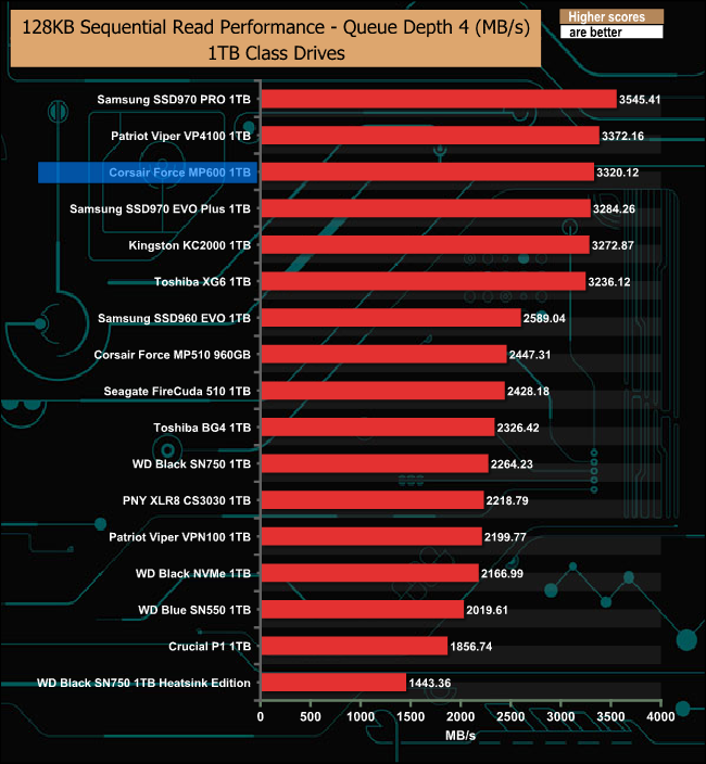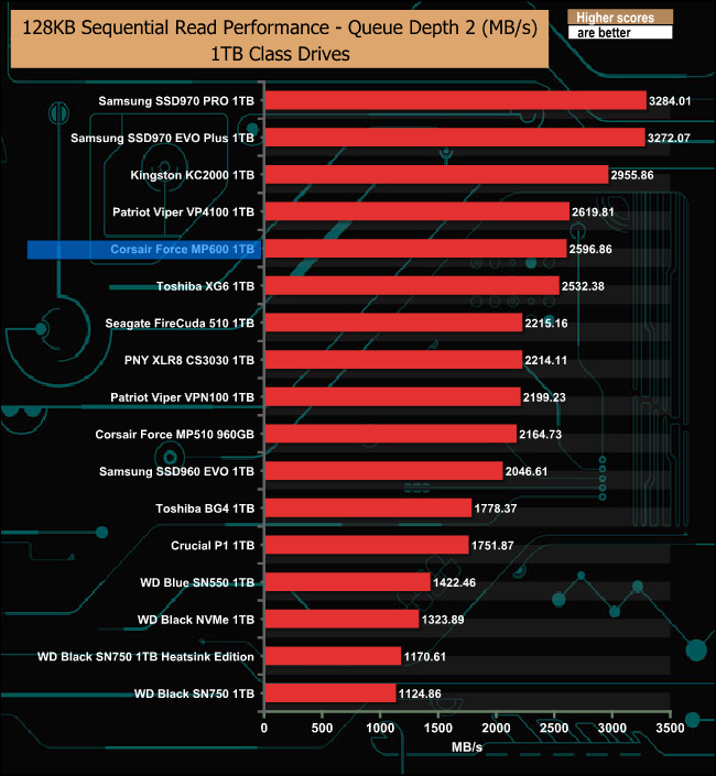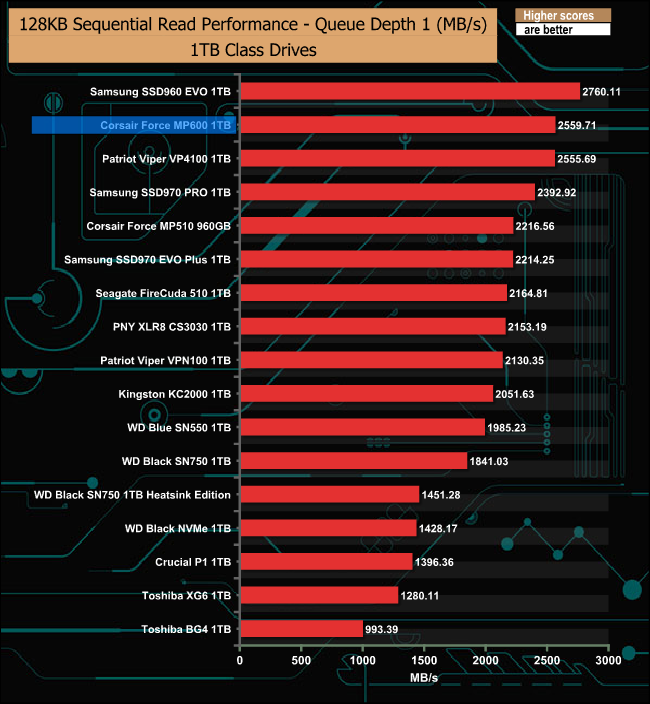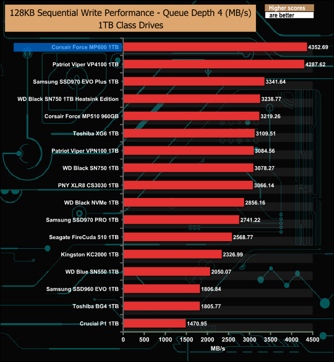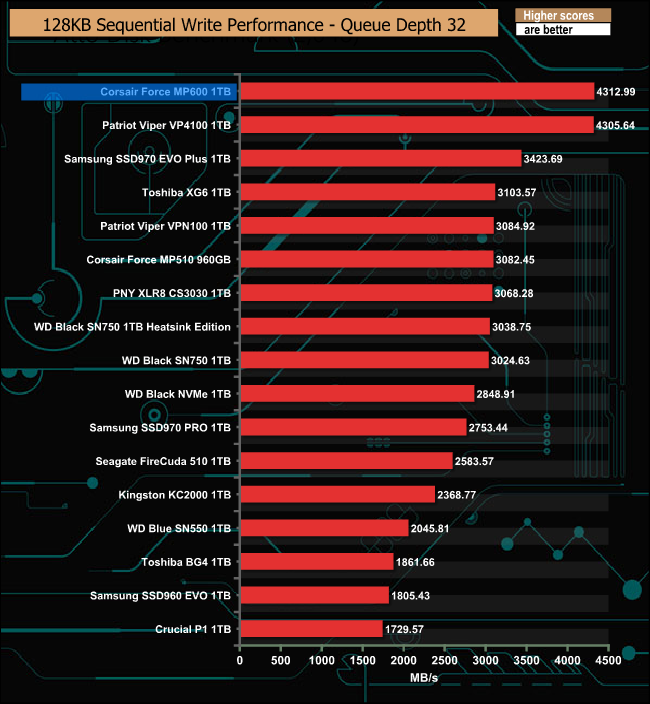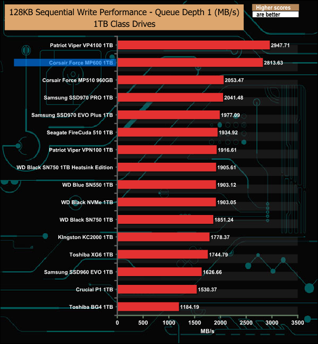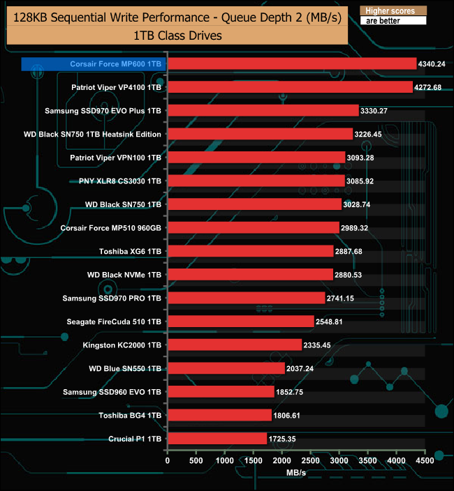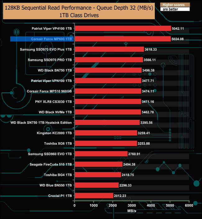 At a queue depth of 1, the Force MP600 is a tiny bit faster than the Patriot VP4100, but as the queue depth deepens, the Patriot drive takes over.