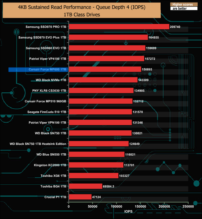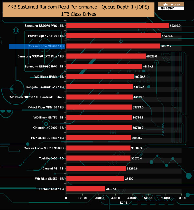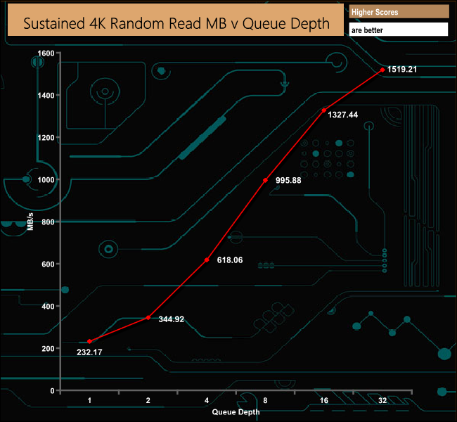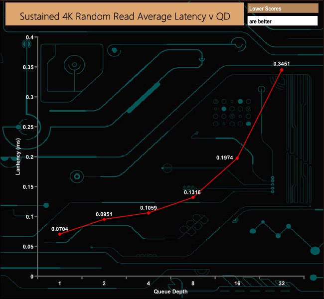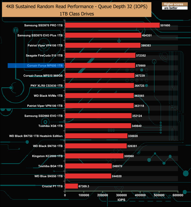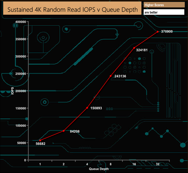 The official IOPS 4K random read rating for the drive is up to 680,000 IOPS (QD32). With our 4K four threaded tests, the fastest read speed we saw was 370,900 IOPS, at a QD of 32.