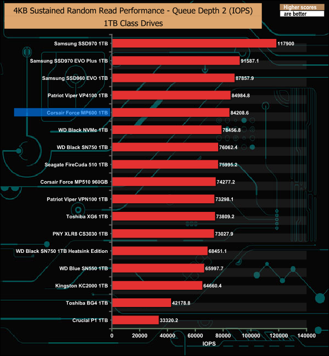 The Force MP600 falls behind the Gen4 Patriot Viper VP4100 in our 4K random read tests at all the tested queue depths.