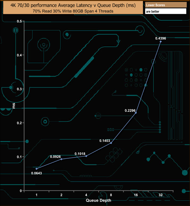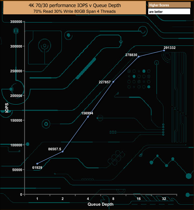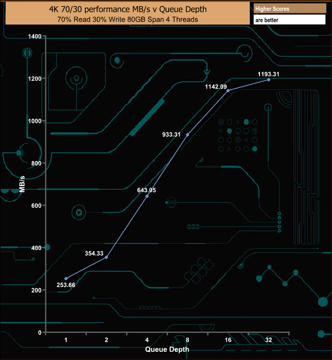 The MP400 displays strong performance in our mixed 70/30 read/write tests, peaking at 291,332 IOPS (1,193.31MB/s) at a QD of 32.