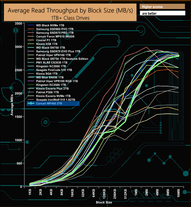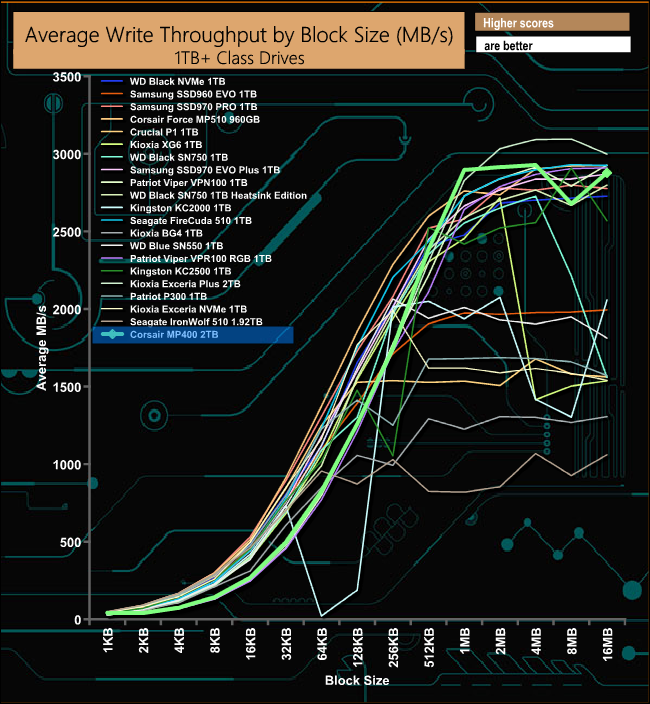 The write throughput performance puts the MP400 comfortably in the top ten drives we've tested to date.