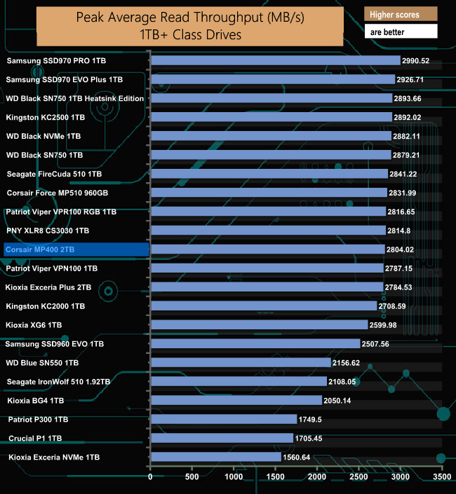 The MP400's peak throughput figure of 2,804.02MB/s puts it firmly in the middle of our results chart.