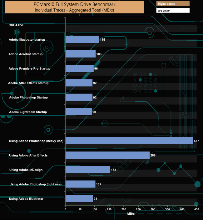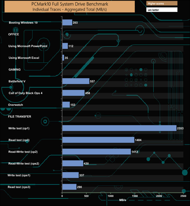 The PCMark 10 Full System Drive Benchmark uses a wide-ranging set of real-world traces from popular applications and common tasks to fully test the performance of the fastest modern drives. The benchmark is designed to measure the performance of fast system drives using the SATA bus at the low end and devices connected via PCI Express at the high end.