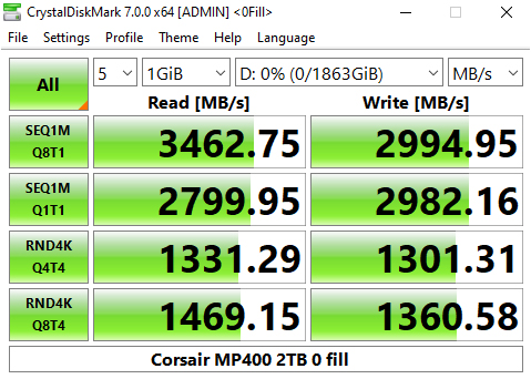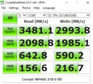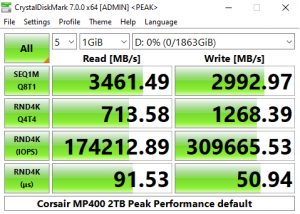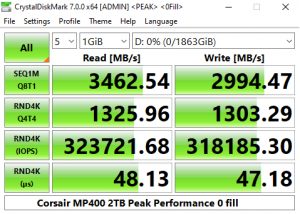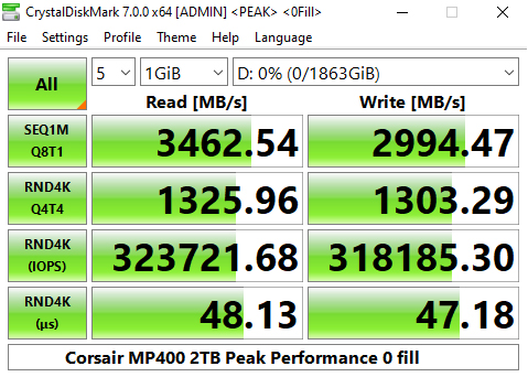 Looking at the Peak Performance results for Sequential read/write performance we could confirm both official Sequential performance figures. The drive is rated up to 3.480MB/s for reads, with the tested drive producing 3,462MB/s and up to 3,000MB/s for writes, with a test result of 2,994MB/s.