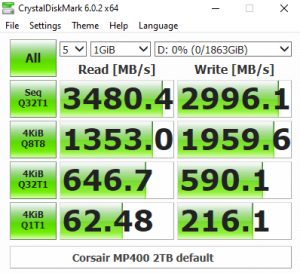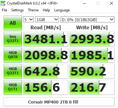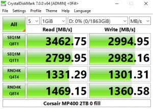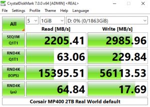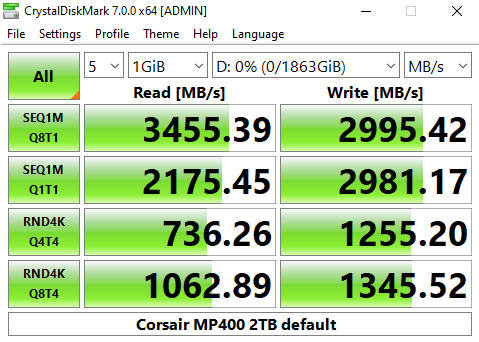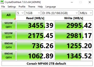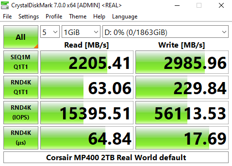 Corsair's 2TB MP400 performs well in CrystalDiskMark's deeper queue depth 4K test. From looking at the two benchmark result screens, it seems that the controller has a preference for handling compressible data. Using this type of data sees a big boost in the random read performance at queue depths 1 and 8.