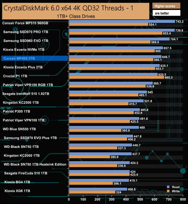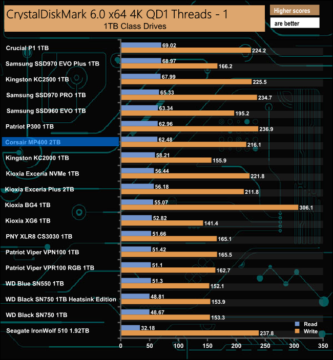 At a queue depth of 1, the MP400 performs well, sitting in the top ten of our results chart.