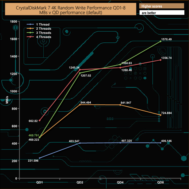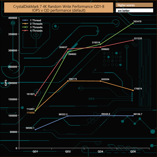In the write tests, the best overall performance comes from the three threaded tests which peak at the QD8 mark at 383,419 IOPS (1,570.49MB/s).