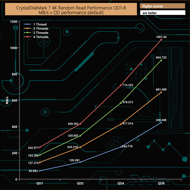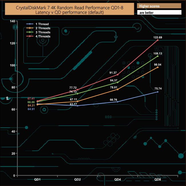We also used CrystalDiskMark 7 to test the drive at lower queue depths (where most of the everyday workloads occur) using 1 to 4 threads. The read performance climbs smoothly throughout the tested queue depths and threads.