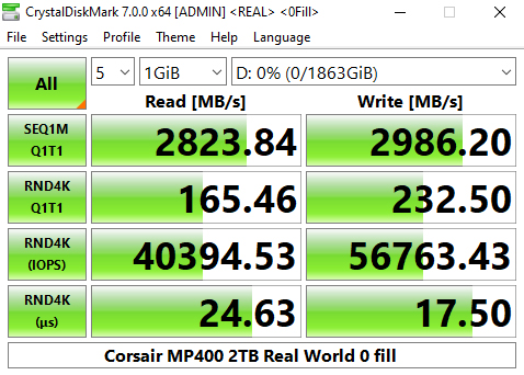 The latest version of CrystalDiskMark, version 7, includes a couple of profiles that can be used for testing – Peak Performance and Real World. The result screens for these two profiles not only display MB/s results but also IOPS and latency.