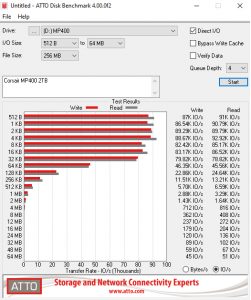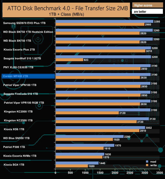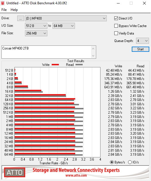 Officially the 2TB MP400 is rated as up to 3.480MB/s and up to 3,000MB/s respectively for Sequential read/write performance. Using the ATTO benchmark we couldn't quite make those maximum figures with the tested drive producing a read figure of 3,190MB/s and 2,830MB/s for writes.