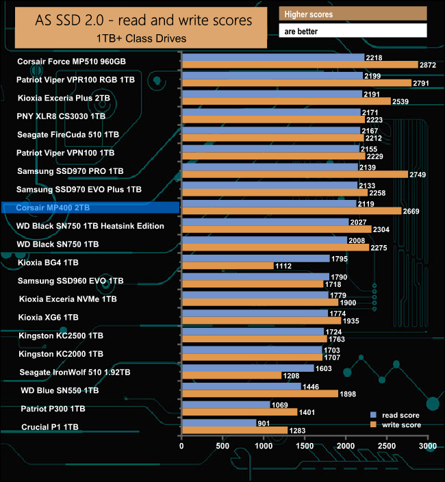 In the ASSSD benchmark, the read score of 2119 is enough to place the 2TB MP400 into the top ten of 1TB+ NVMe drives we've tested. However the write score of 2669 is good enough to put the drive into the top 5 tested drives.