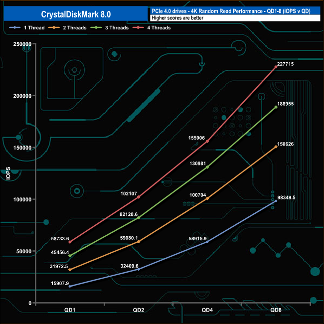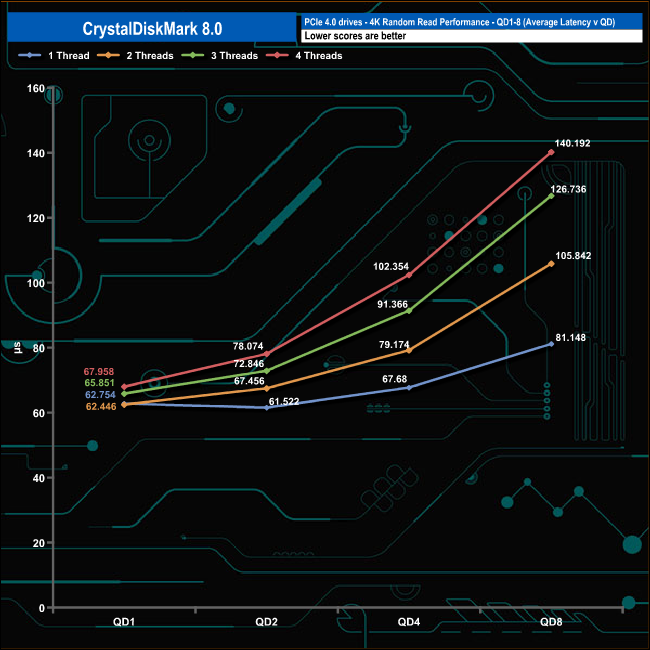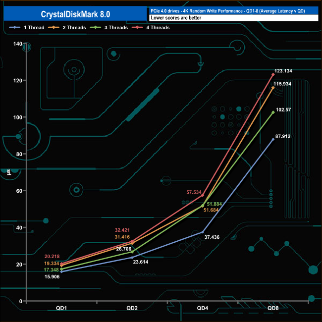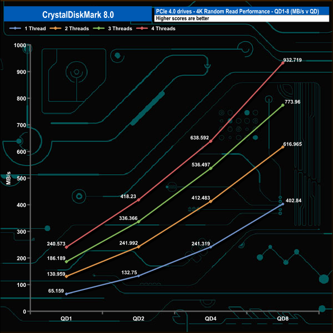 We used CrystalDiskMark 8 to test the random performance of the drive at lower queue depths (QD1 – QD8 where most of the everyday workloads occur) using 1 to 4 threads.
